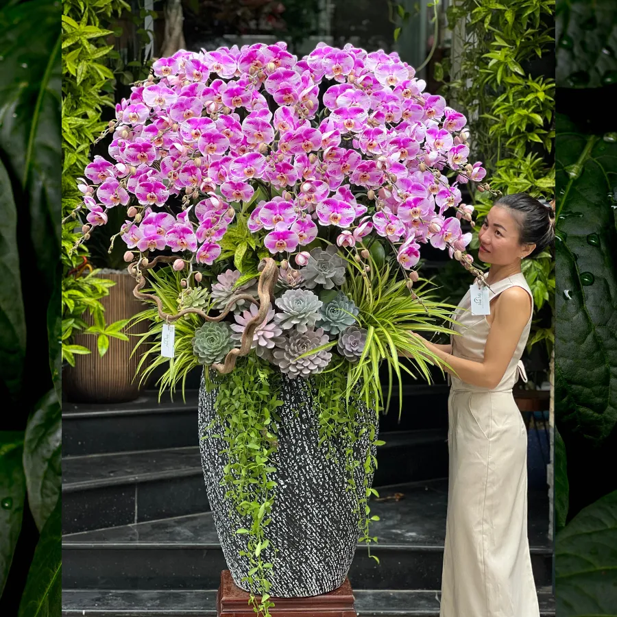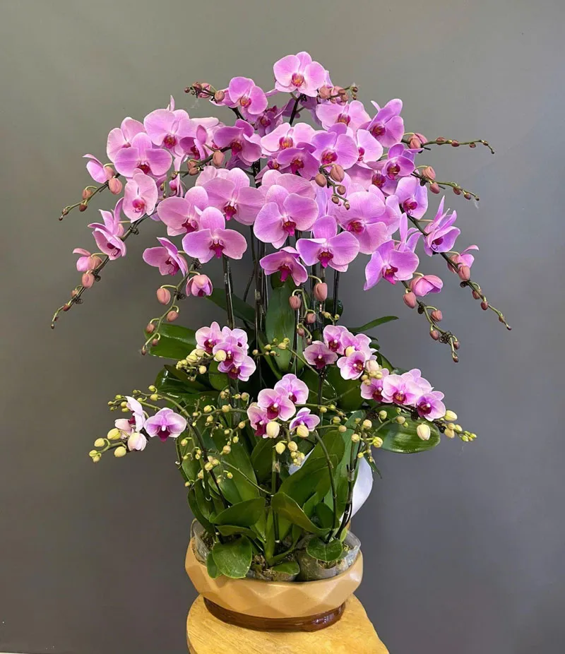 Lan hồ điệp đa chậu thường có từ 3 cành trở lên (5–10–15 cành), được thiết kế trong chậu lớn hoặc phối nhiều cây.